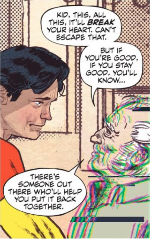 Given these ghosts, its perhaps worthwhile to consider their presence within the final issue. Going in chronological order, Oberon is a tearful farewell. An apology for what Scott tried to do and a reassurance that he’s still a good person. As stated above, Oberon is more of a father in this story, and it is here where this shines the most. Oberon offers not only a shoulder for Scott to cry beautiful, ugly tears, but they share a tenderness toned in a way as to be more fatherly than that of Scott’s initial interaction with Highfather. (Indeed, this final farewell occurs shortly after the ghost of Scott’s own “father” appears. In that moment, Scott rejects Highfather in favor of Oberon on the grounds that he’s a patronizing dick that thinks not giving up your son to Darkseid is a sign of failure.)